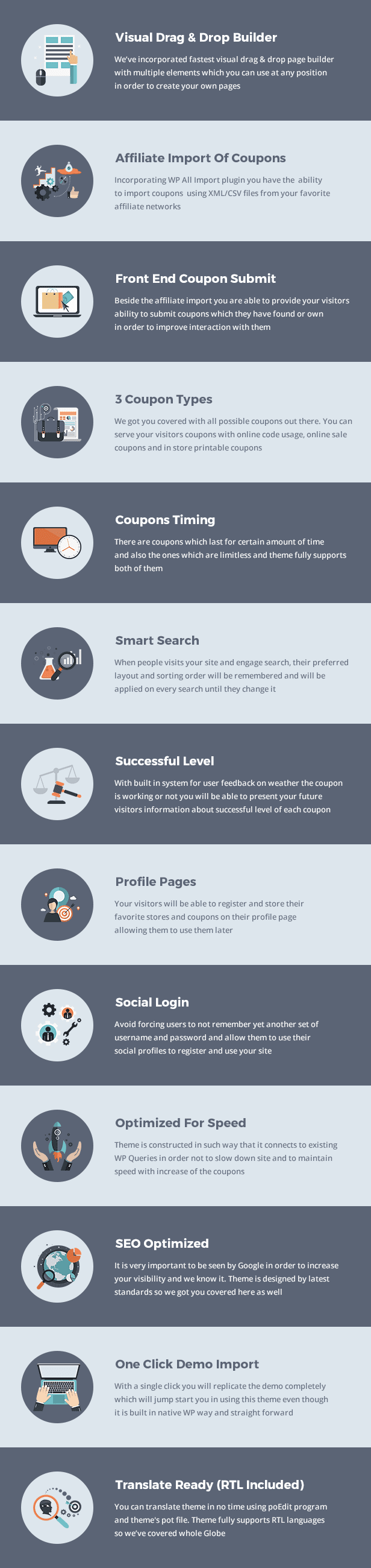 Couponis is one of a kind theme which is designed to serve coupons either submitted by your users or imported via XML/CSV file from the affiliate network or both. Theme is designed to be super fast and not to add any stress to WP queries while providing best features at the same time. With the help of WP All Import plugin ( free version is enough ) you are able to import any coupons via XML/CSV file provided by your affiliate network.