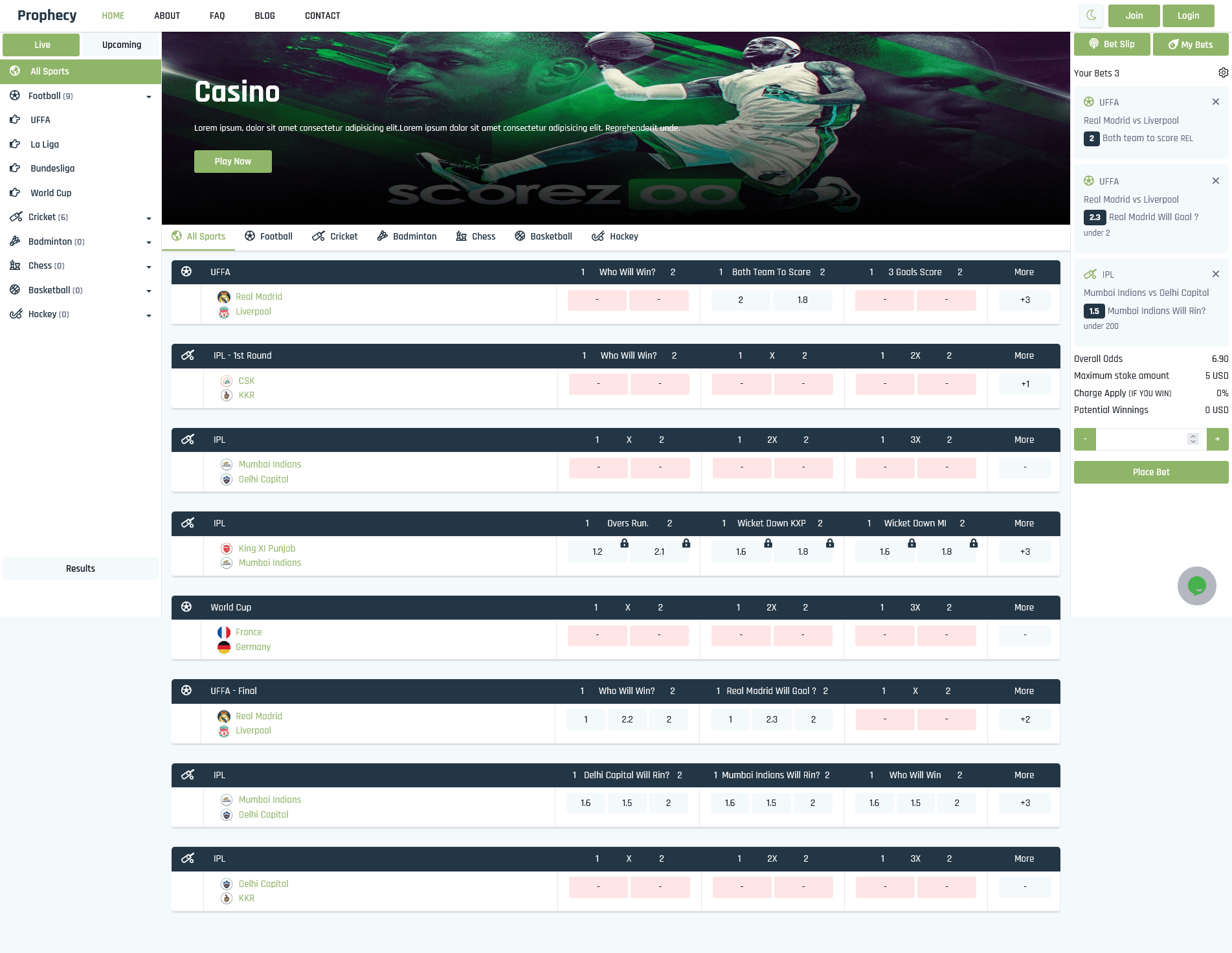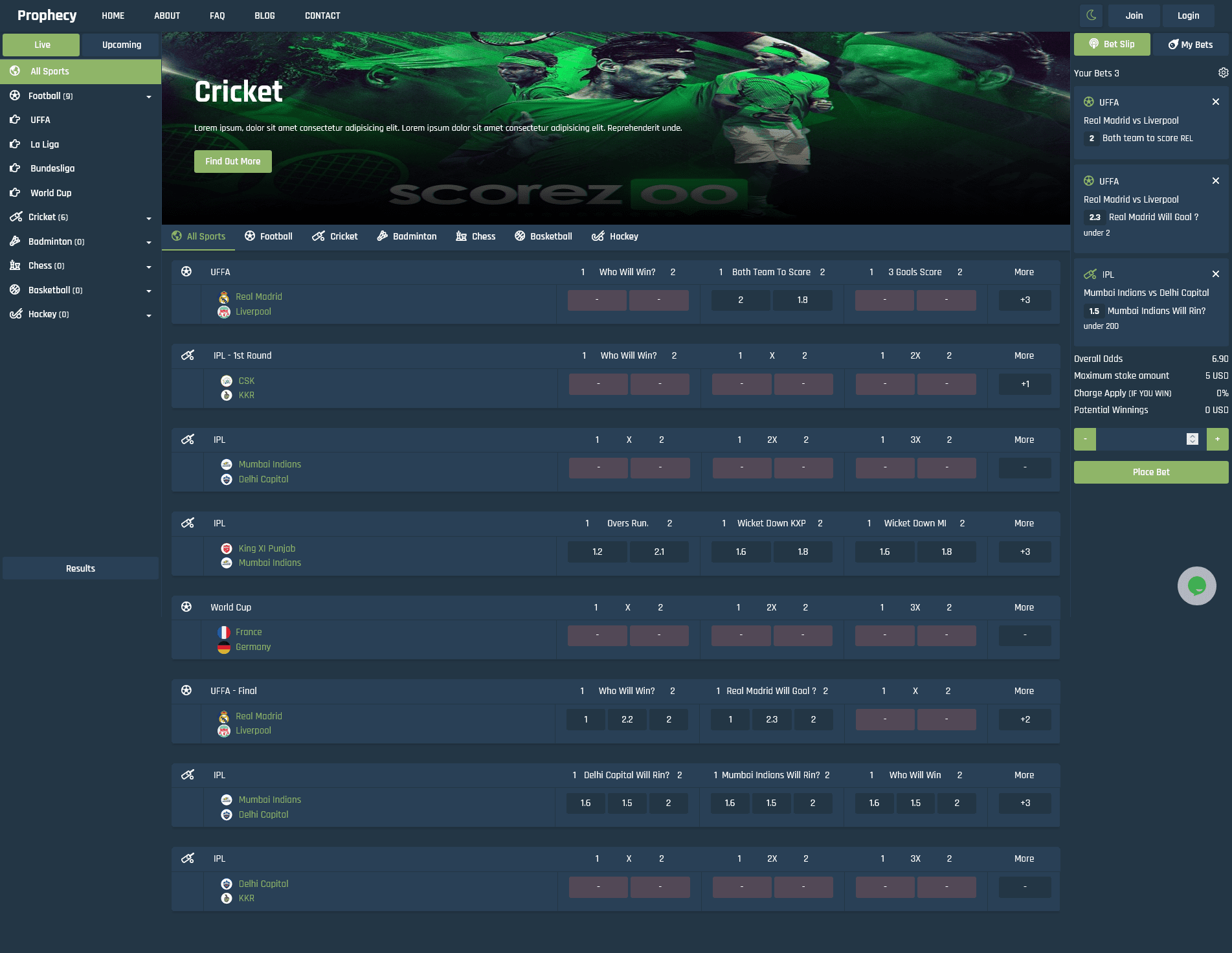 Prophecy is a betting management system. It can be used to guess the result of WorldCup / Tournament matches in a kind of prediction. The players compete in guessing the correct result of some kind of match. Soccer, Cricket, Baseball, Basketball, or even Yes/No questions like: will Brazil win the next WorldCup. At first User need to deposit for predicting. User will get interest followed by ratio. Admin can control match lock/unlock, ratio update, question , option add instantly where user doesn’t need to website reload.